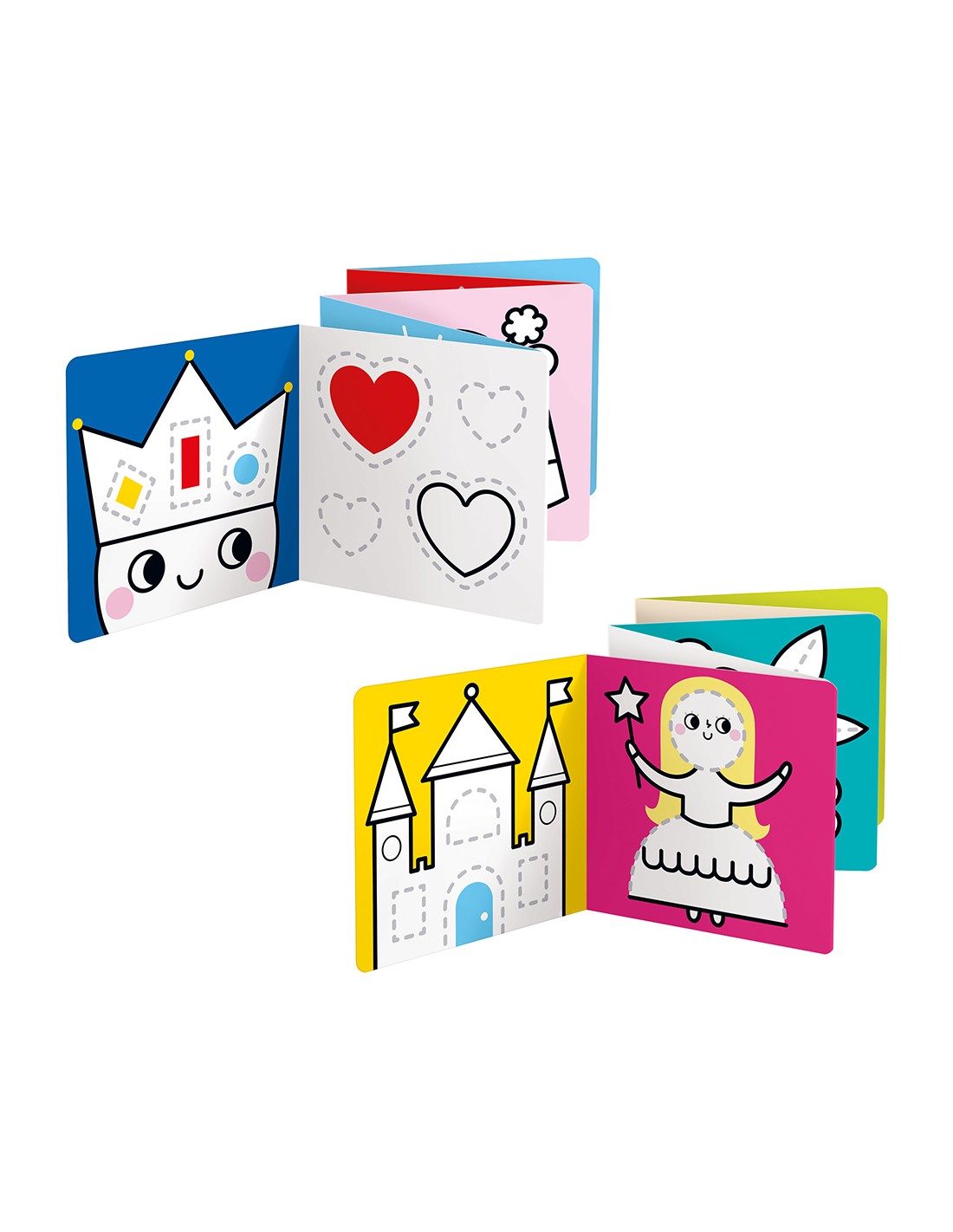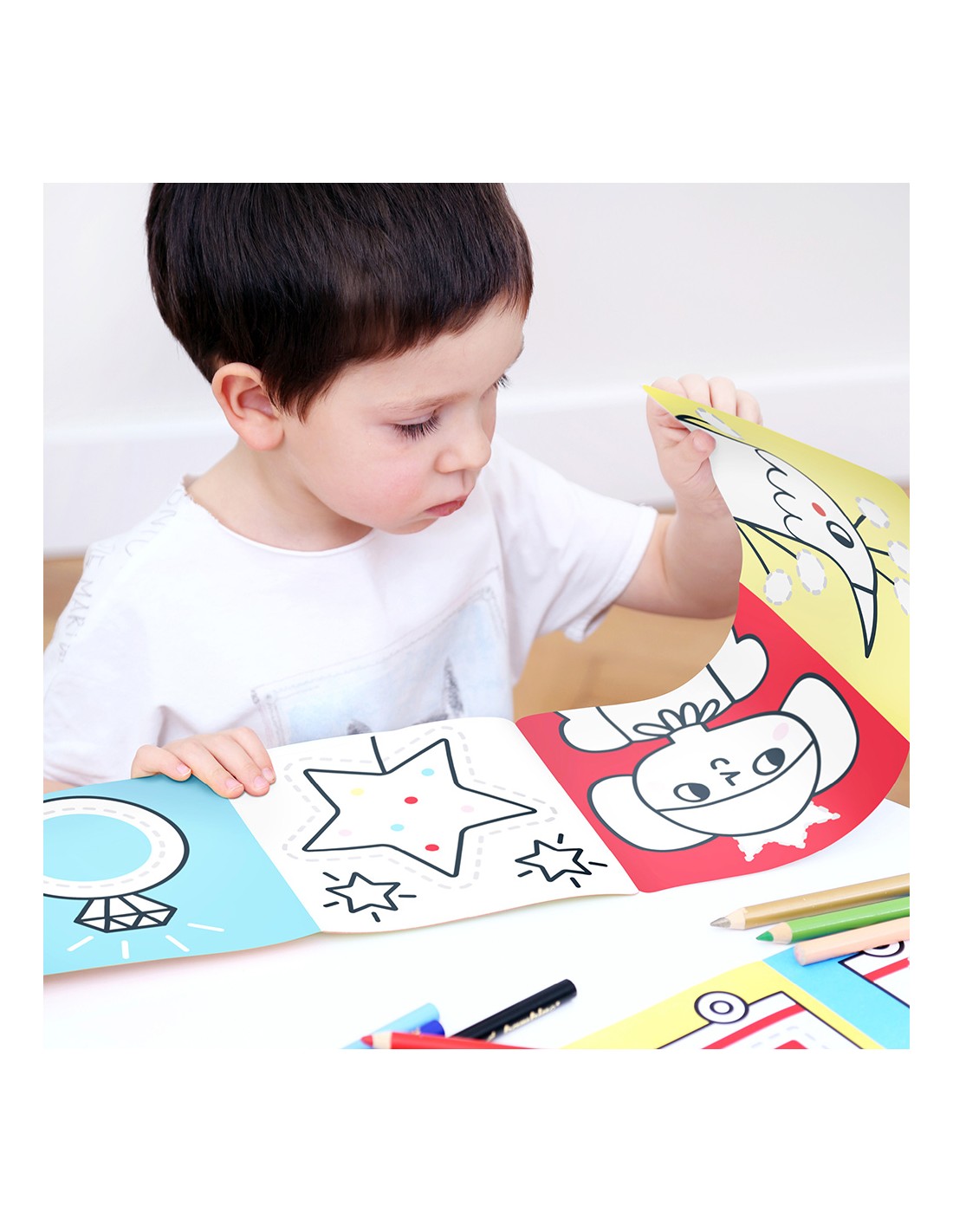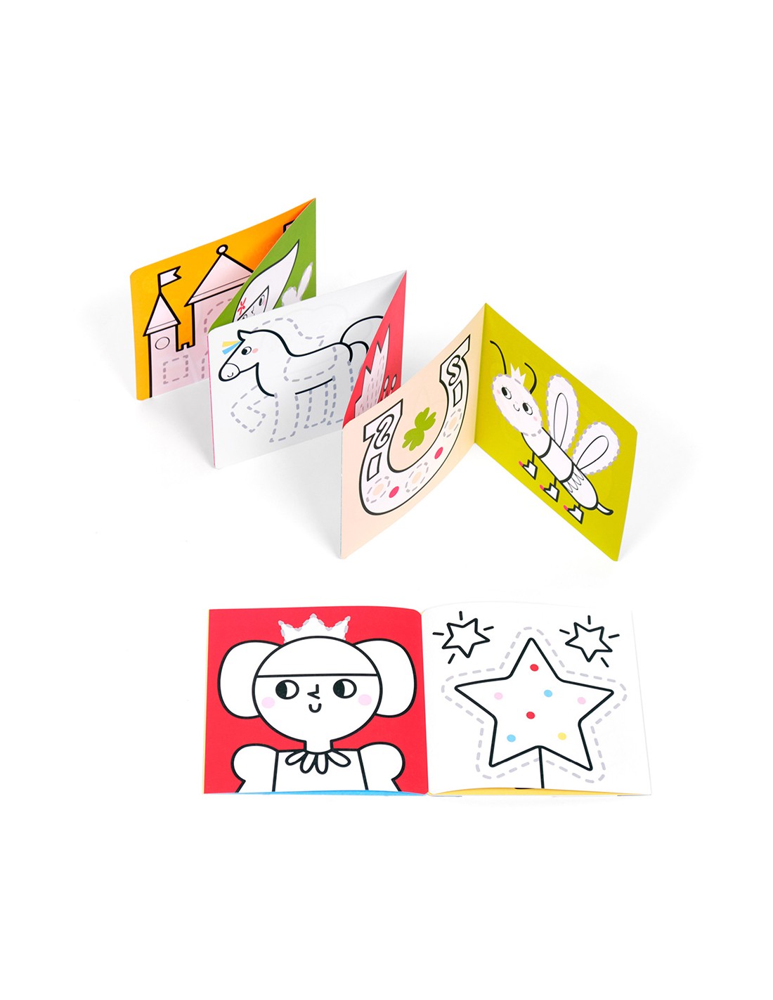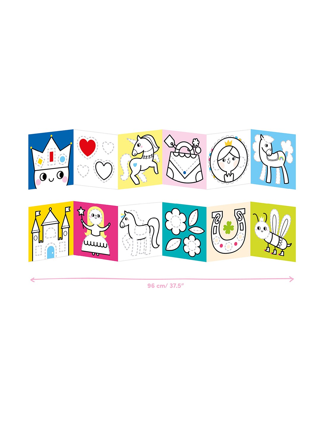 Καλώς ήρθατε στην πολύχρωμη χώρα των θαυμάτων! Εκεί θα βρείτε χαμογελαστούς κατοίκους που θέλουν τη βοήθειά σας για ναενώσουν γραμμές! Αυτό το δημιουργικό σετ περιέχει 2 μεγάλα (96cm!) βιβλία ακορντεόν με 23 ασκήσεις και εικονογραφήσεις γεμάτες διασκεδαστικές λεπτομέρειες, που θα ενθαρρύνουν τα παιδιά να πάρουν τα κραγιόνια τους και να κάνουν τις πρώτες τους απόπειρες ζωγραφικής.
