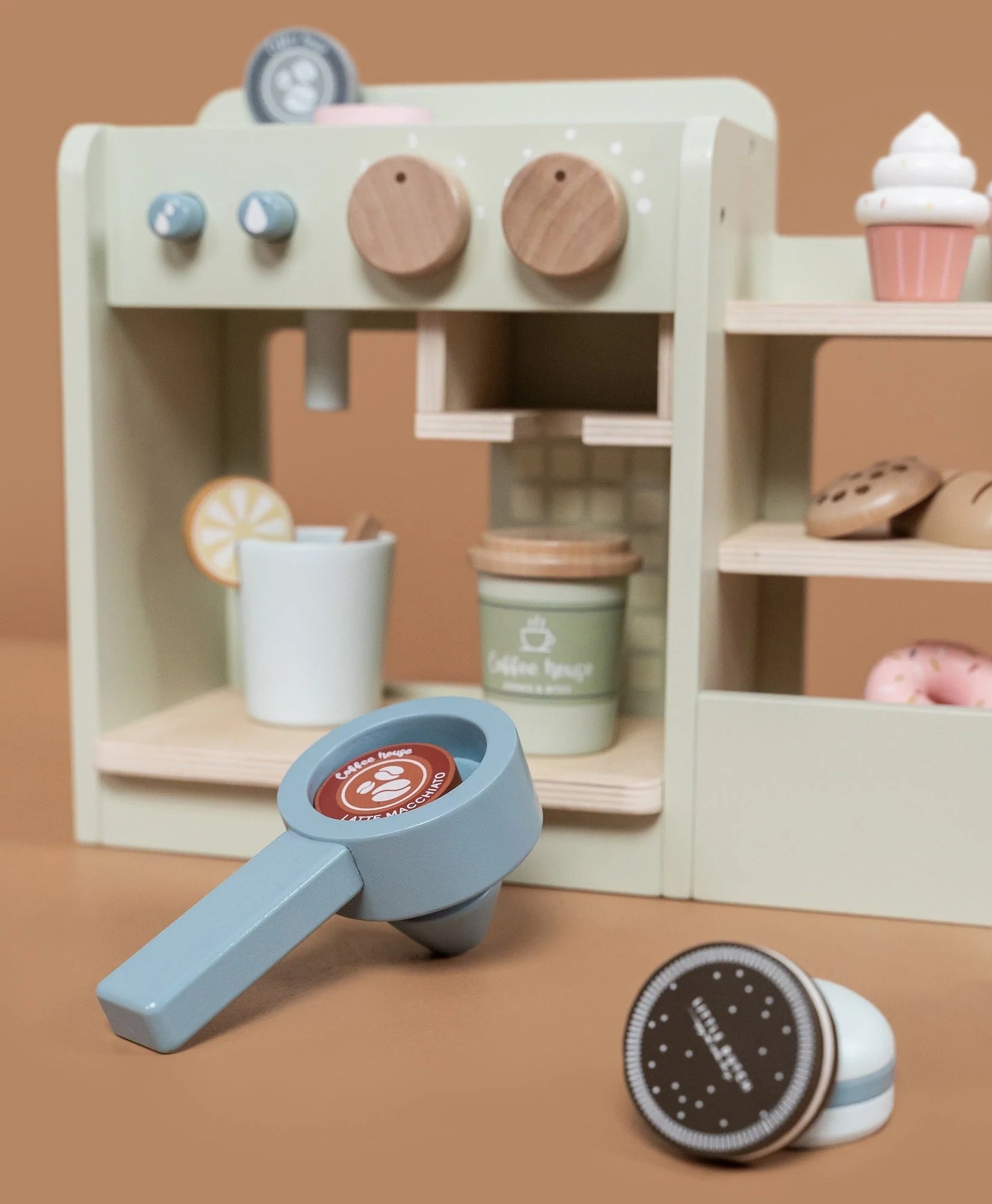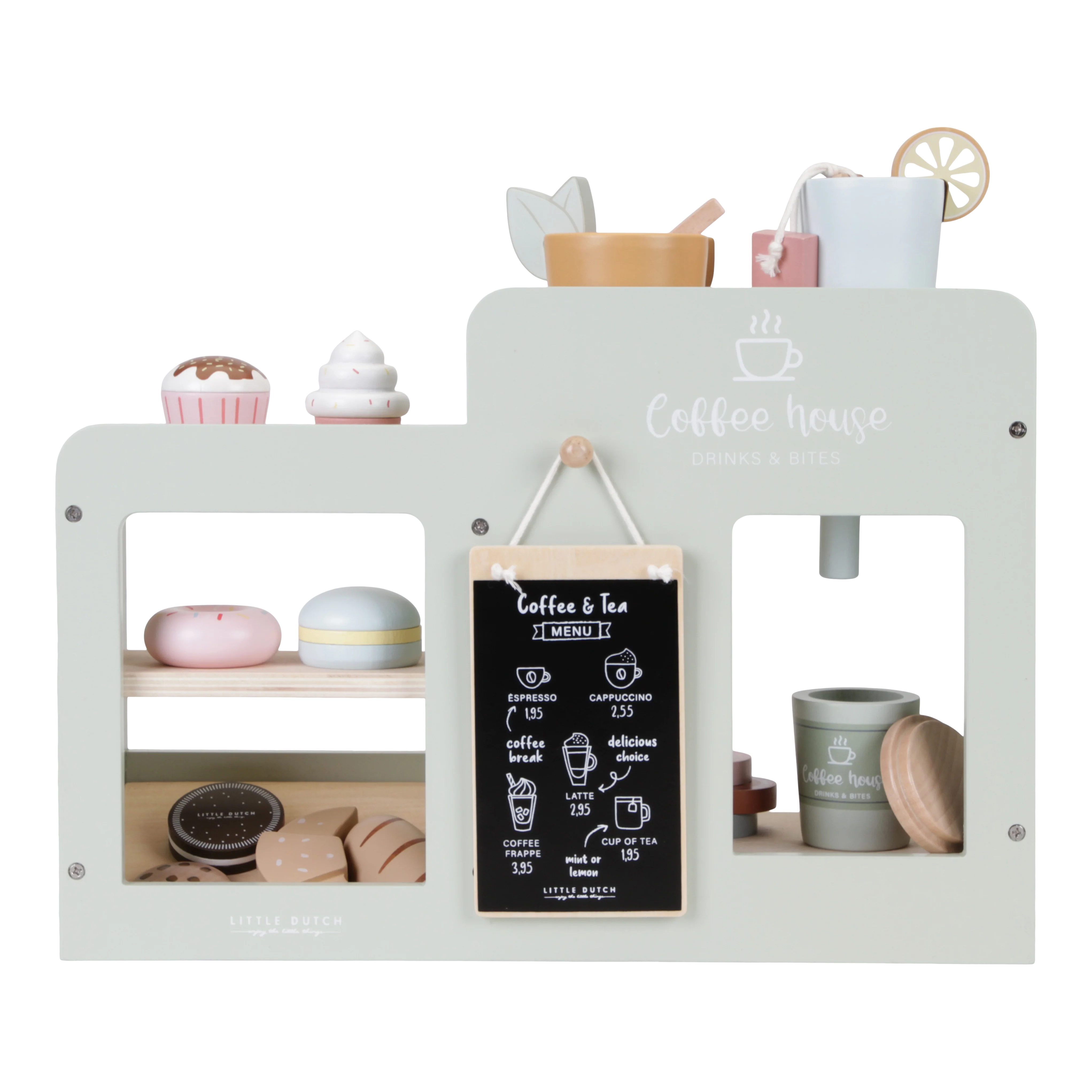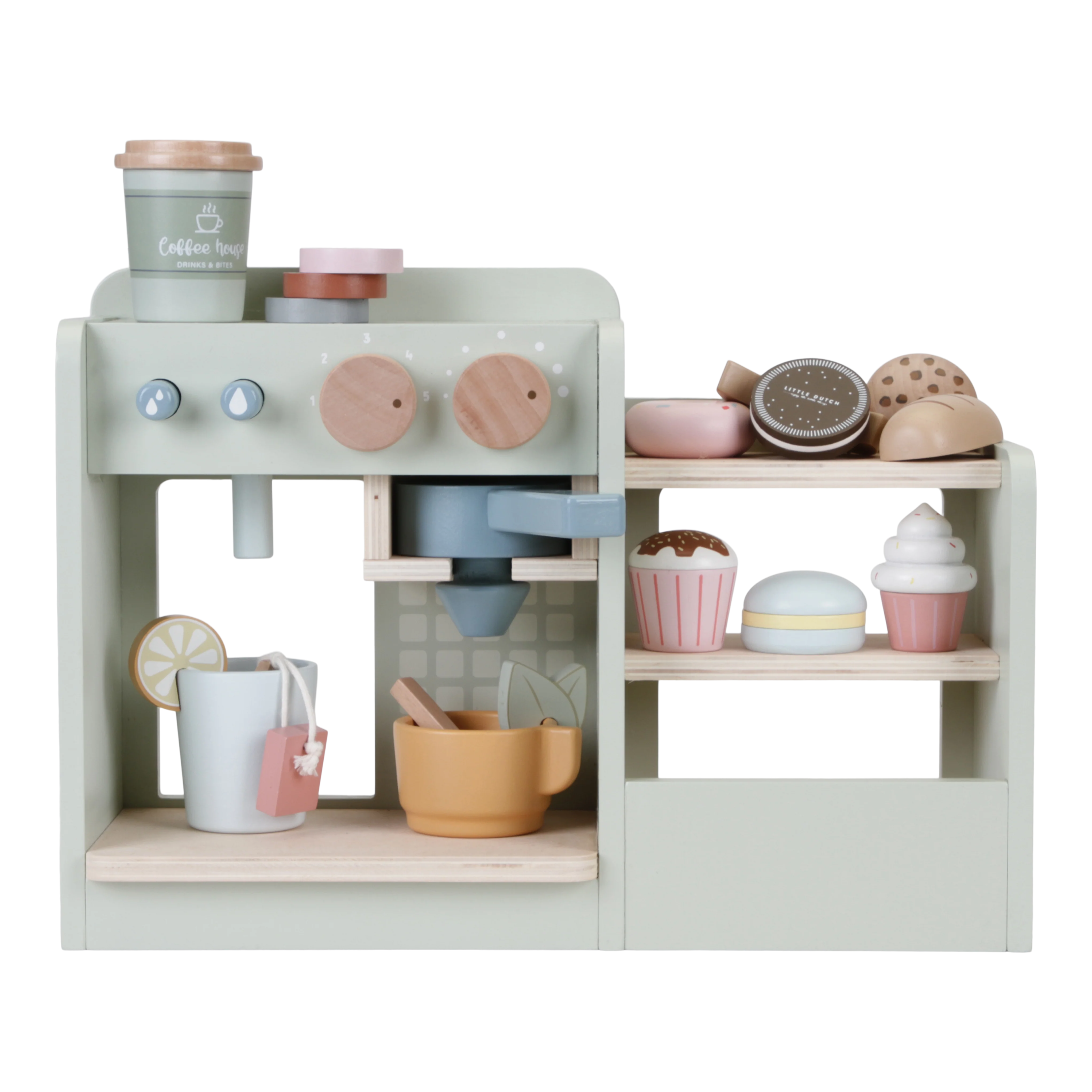 Καφέ ή τσάι? Θα θέλατε να πάτε ένα μπισκότο ή ένα κέικ; Με αυτό το υπέροχο ξύλινο σετ παιχνιδιών έχετε αμέσως ένα μέρος για να παίξετε σπίτι ή να παίξετε μαγαζί. Γίνετε αληθινός barista και φτιάξτε στη μαμά και τον μπαμπά σας ένα ωραίο φλιτζάνι καπουτσίνο με τη δική σας καφετιέρα. Ή σερβίρετε στο δικό σας καφενείο ένα μενού γεμάτο με νόστιμες λιχουδιές.