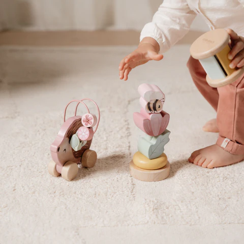 Στο εσωτερικό του, θα βρείτε μια ευφάνταστη κουδουνίστρα, ιδανική για να την πιάνουν και να την κουνάνε τα μικροσκοπικά χεράκια. Υπάρχει επίσης ένα αξιολάτρευτο παιχνίδι ταξινόμησης που επιτρέπει στο παιδί σας να φτιάξει ένα ζωντανό λουλούδι με μια γλυκιά μελισσούλα στην κορυφή. Την τριάδα συμπληρώνει ένας κυλιόμενος σκαντζόχοιρος, όμορφα στολισμένος με ένα φύλλο, μια μέλισσα και λουλούδια που χορεύουν κατά μήκος της σπείρας στην πλάτη του.