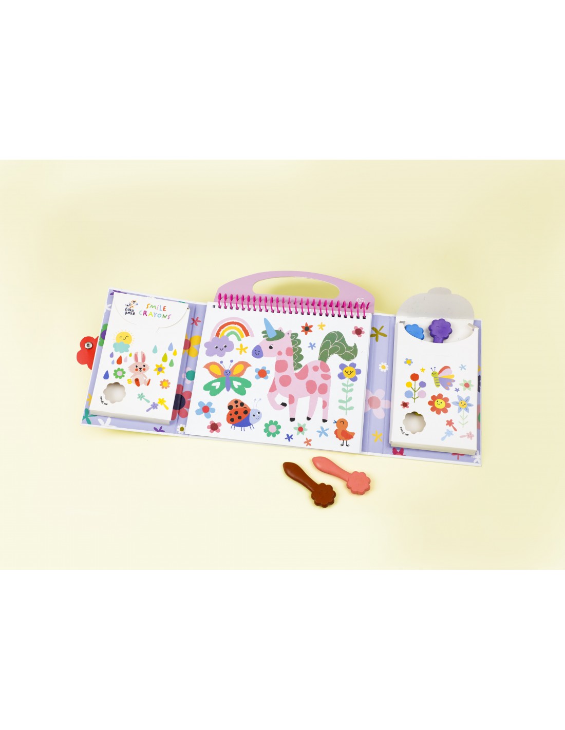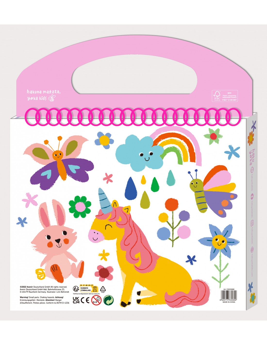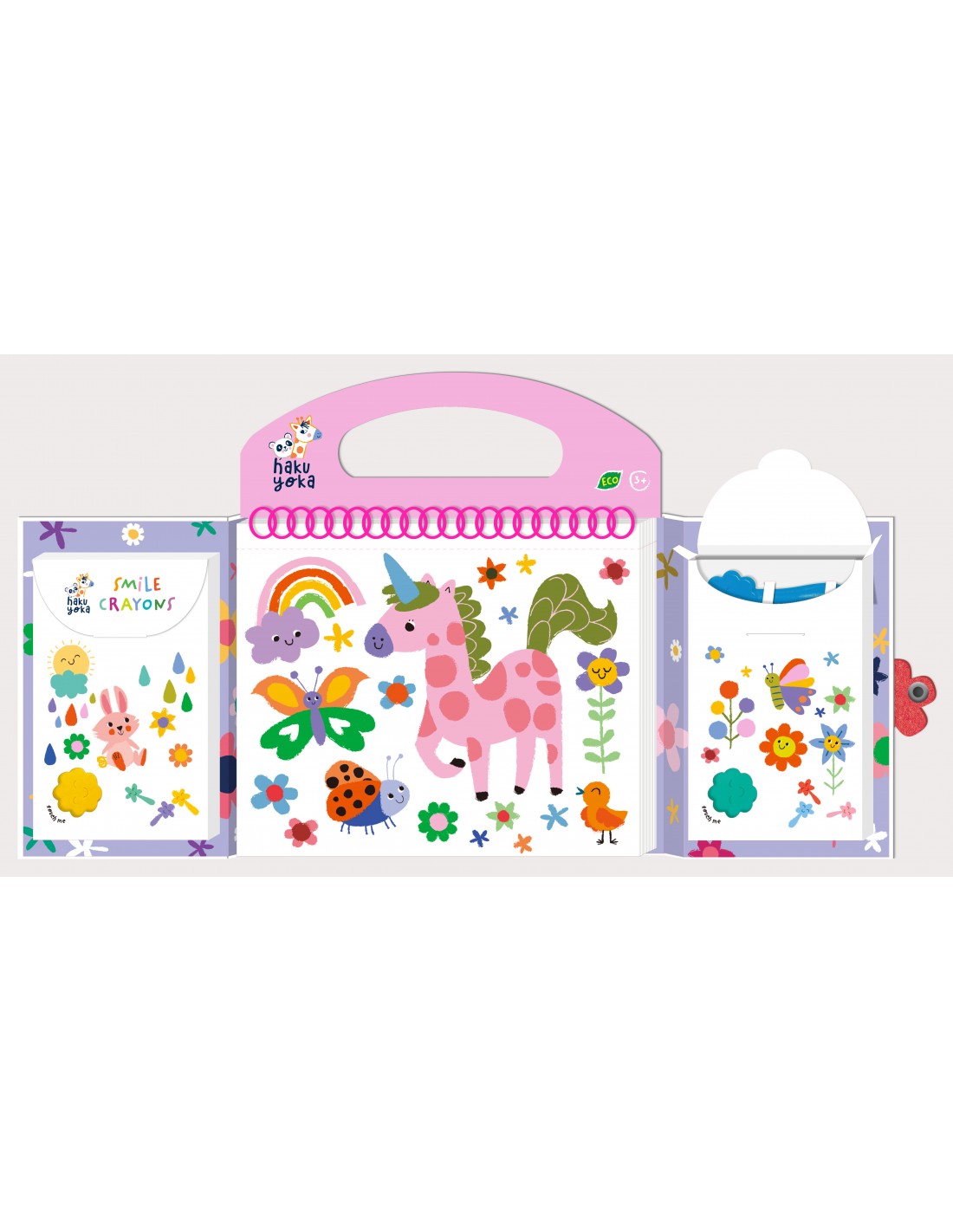 Αποτελείται από 35 φύλλα ζωγραφικής γεμάτα μονόκερους και 6 ‘χαρούμενες’ κηρομπογιές για ατελείωτες ώρες διασκέδασης και δημιουργίας.